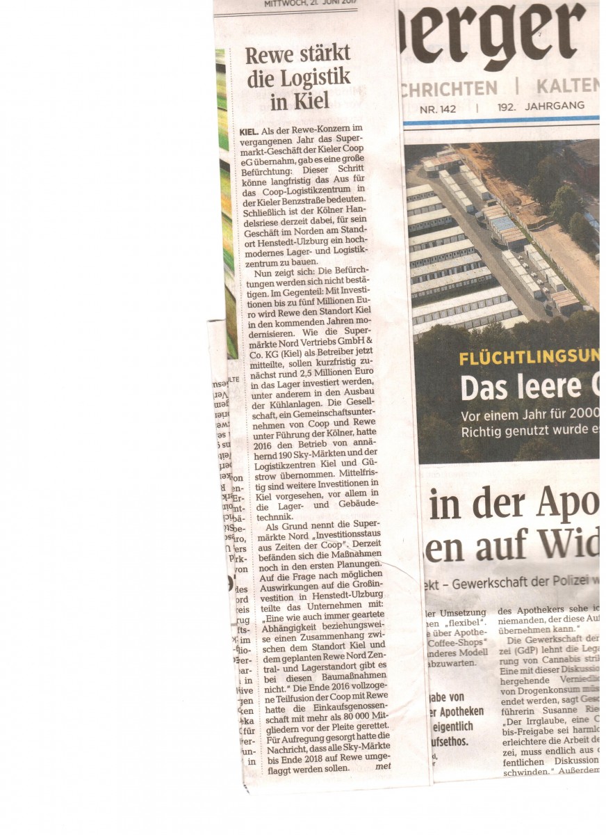 Die von der WHU-Fraktionsvorsitzenden immer wieder ins Feld geführten über 2.000 LKW (statt 888) können durch diese nicht nachgewiesen werden und sind geboren aus dem Wunsch, das Projekt in ihrer Nachbarschaft mit allen Mitteln zu verhindern. Dazu gehört auch das Märchen, REWE könnte nach Fusion mit der Coop den Kieler Standort schließen und ihn nach Henstedt-Ulzburg verlegen. Gegenläufige Aussagen der REWE-Vertreter im Finanz- und Wirtschaftsausschuss werden schlichtweg ignoriert, weil man sie nicht hören will. Wir haben die Aussagen des Unternehmens dazu aus dem Wirtschaftsteil der Segeberger Zeitung für Sie kopiert (siehe unten).