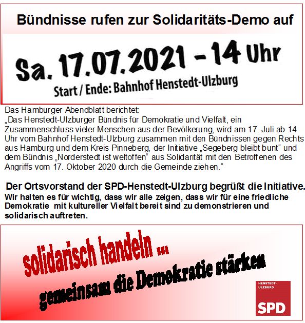 Fraktion Ortsverein Kommunalwahl Archiv Mein Bereich 17 Juli 2021 Solidaritäts-Demo Bahnhof Henstedt-Ulzburg, Bahnhofstrasse 1, 24558 Henstedt-Ulzburg Beginn um 14:00 Uhr Veranstaltungsort