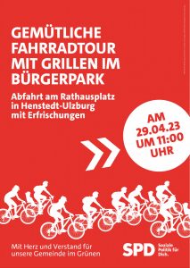 Los geht’s am 29. April 2023 um 11 Uhr, Treffpunkt ist der Rathausplatz. Einen erfrischenden Zwischenstopp werden wir gegen 12.00 Uhr am Schäferkampsweg einlegen und die Ausfahrt endet im Bürgerpark, wo Grillwürstchen und Getränke auf die Radler warten.