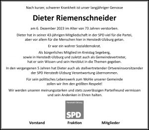 Fraktion Ortsverein Kommunalwahl Archiv Mein Bereich Trauer um Dieter Riemenschneider verfasst am 13. Dezember 2023 NeuesteArtikel Jahreshauptversammlung Vorstandswahlen Pressemitteilung Personalwechsel in der SPD-Fraktion Mitgliederversammlung 50 Jahre SPDJubilar Rudi Hennecke Pressemitteilung zur Flüchtlingsberatung Kein Umdenken der Gegenseite