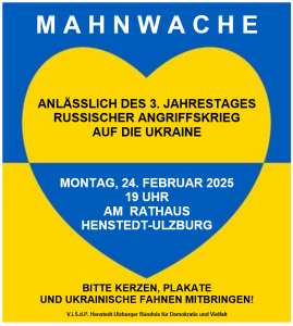 Fraktion Ortsverein Kommunalwahl Archiv Mein Bereich 24 Februar 2025 Mahnwache Am Rathaus Henstedt-Ulzburg, , Beginn um 19.00 Uhr Veranstaltungsort